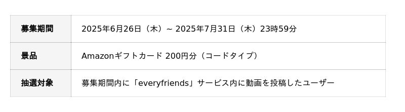 先着でAmazonギフトカードゲットのチャンス! 「everyfriends(エブリフレンズ)」の開設を記念し、「everyfriends」のアカウント作成後に、動画を投稿してくださった方の中から、先着で1,000名様にAmazonギフトカードをプレゼントいたします(※)。