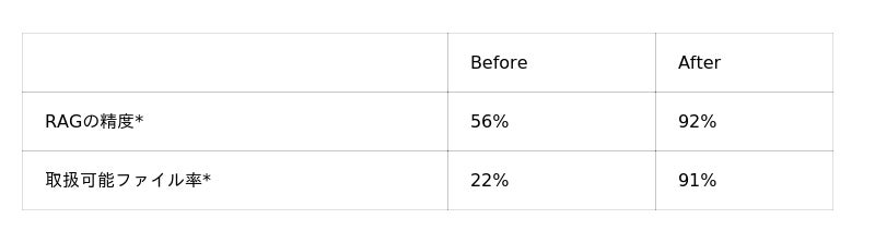 * RAGの精度は、事前に準備したサンプルQAデータに合致した意味合いの回答を行った割合を集計したものです。また、取扱可能ファイル率はテキストで構成されている RAG で正しく認識することが確認できたデータの割合です。すなわち、本実験対象のうち 69%(91-22)のデータがエクセルやパワーポイントなど読み取りが難しかったデータであり、RAG Ready Converter によってRAGで正しく認識することができるようになったということを意味します。