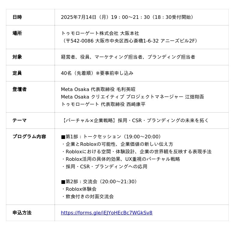 デジタル空間やeスポーツを活用して地域課題を解決する株式会社Meta Osaka(所在地:大阪市、代表取締役:毛利英昭、以下「Meta Osaka」)は、企業ブランディングを手掛けるトゥモローゲート株式会社(所在地:大阪市、代表取締役:西崎康平、以下「トゥモローゲート社」)と連携し、世界3.8億ユーザーを持つゲームプラットフォーム「Roblox」を活用した「バーチャル採用」手法を発表します。従来のオンライン説明会の課題を解決する第三の採用手段として、Roblox上にトゥモローゲートのバーチャルオフィスを企画・制作しました。この取り組みの発表会・体験会を、2025年7月14日、トゥモローゲート大阪本社にて、関西圏の経営者・役員層を対象に開催します。