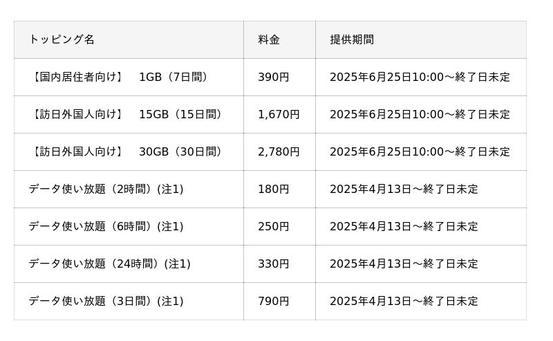 国内居住者向けには、初回限定トッピングとして「1GB(7日間)」の提供を開始します。