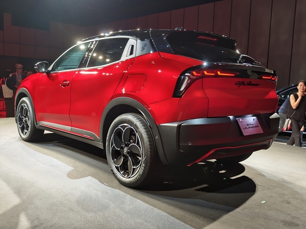 チーフエクステリアデザイナーのボブ・ロムケス氏によれば、ジュニアのデザインはアスリートをイメージした曲線をまとった美しいシルエットが特徴で、航空力学を取り入れたイタリアの美学と情熱が凝縮されているといいます。単なる直線や平面は存在せず、影と光のコントラストで動きとダイナミズムを表現する「スカルプチュラルなデザイン」が採用されています。特に、ヘッドランプは「ジュニアの瞳」として特徴的な3×3のライティングシグネチャーを持ち、中央の「スクデット」はブランド初のEVという新しいテクノロジーへの移行を告げる存在だそうです。