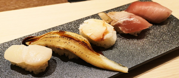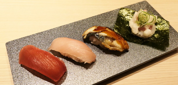 季節限定のお寿司は、とろびんちょう握り、まぐろ山かけ手巻き、炙り鰻握り、ひとくち鰻玉ちらしだ。