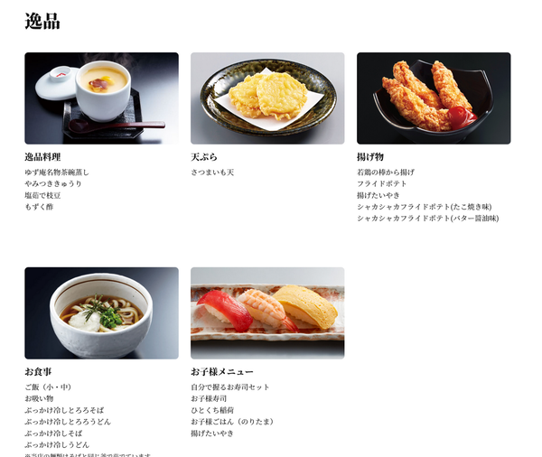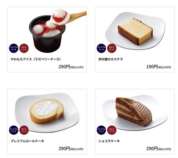 デザートでも、プレミアムシャーベット、井村屋のカステラ、やわもちアイス(黒蜜きなこ)、やわもちアイス(ラズベリーチーズ)、プレミアムロールケーキ、ショコラケーキがオーダー可能だ。
