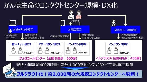 現在、かんぽ生命のコンタクトセンターは、オンプレミスPBX・CTI環境を用いて、顧客向けコールセンター(全国8拠点600席)と拠点窓口向けヘルプデスク(全国6拠点400席)の、合計1000席の規模で運営されている。これをフルクラウド化して、約2000席の大規模コンタクトセンターへと刷新する。