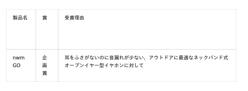 うち、2025年3月に発売したアウトドアやワークアウトと相性抜群のオープンイヤー型ネックバンドワイヤレス耳スピーカー「nwm GO(ヌームゴー)」は、特別賞のうち、製品の革新性や独自性、ユーザーのライフスタイルを豊かにするアイデアなど従来の枠にとらわれない斬新な発想や設計が評価された製品に贈られる「企画賞」に選ばれました。