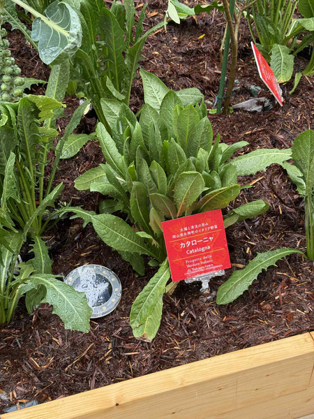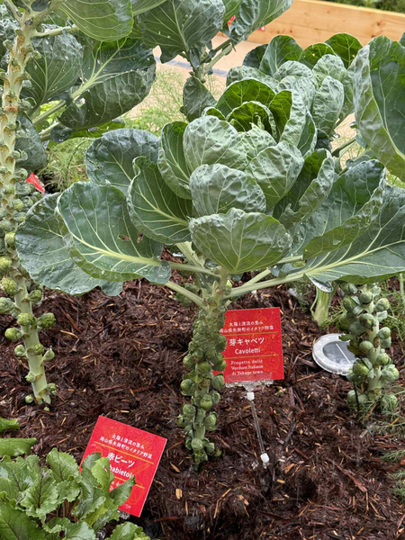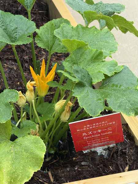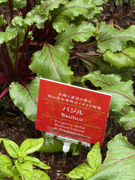 展示野菜はおよそ200鉢。幅8m、奥行き2mの4つの畑に、イタリア料理で使われる野菜を栽培する様子が再現されている。これらの野菜のうち、ズッキーニやバジルなどおよそ15種類は矢掛町で育てられたもの。