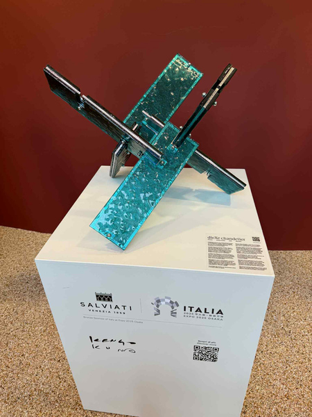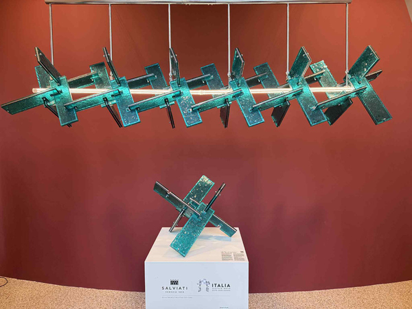 イタリア館入口のエントランスに設置された隈研吾の「dieXe」シャンデリアは、その下に飾られた4つの花瓶とともに、イタリア館のオープニングを飾っている。