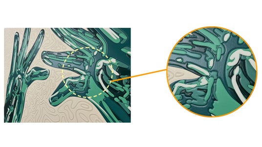 高精度な新開発のプリントヘッドにより描き出された豊かな色彩のフルカラー印刷と立体的なテクスチャの組み合わせは、作品に奥行きを与え、アーティスティックで存在感のある唯一無二のグラフィックを創り出します。しかも、フルカラーのエンボス表現を一点から必要な枚数だけ製作できるため、画一的なデザインで在庫リスクのある既製品を使用することが多い、インテリア装飾の可能性を大きく広げます。