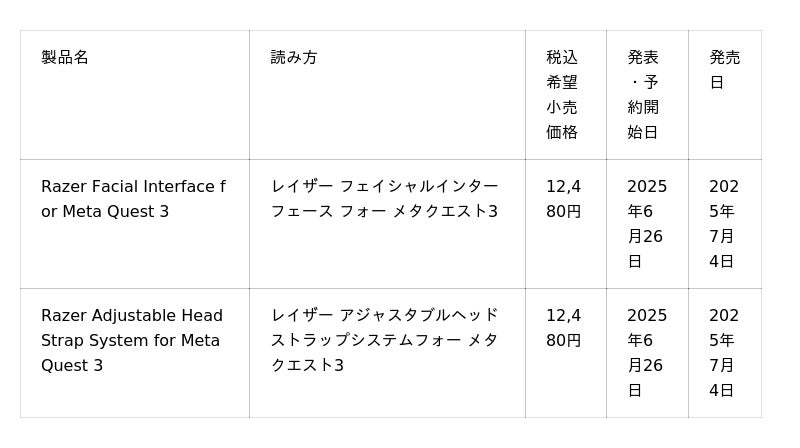 ゲーマー向けライフスタイルブランドとして世界をリードするRazer(TM)(本社:米国カリフォルニア州およびシンガポール、共同創業者兼CEO:Min-Liang Tan)は、Meta Quest 3 向けに開発された新製品「Razer Facial Interface for Meta Quest 3」および「Razer Adjustable Head Strap System for Meta Quest 3」を2025年6月26日より予約開始いたします。販売開始は、2025年7月4日を予定しています。