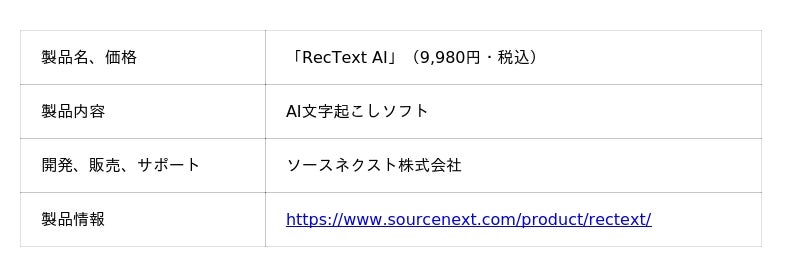 ソースネクスト株式会社(本社:東京都港区赤坂1-14-14 第35興和ビル4階 代表取締役社長:小嶋 智彰)は、6月26日(木)、弊社サイト上でAI文字起こしソフト「RecText AI(レックテキスト エーアイ)」(9,980円・税込、ダウンロード版)を発売いたします。