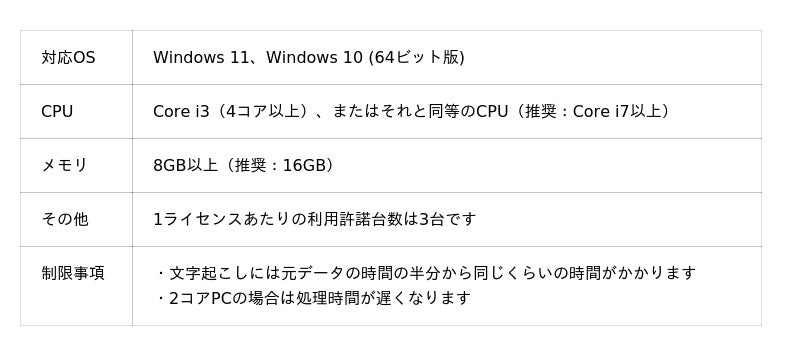 文字起こしサービスの多くは、サブスクリプションモデルが多く、ひと月の文字起こし量にも制限があります。本製品は、一度ご購入いただければ追加の課金はなく、文字起こし量にも制限がありません。