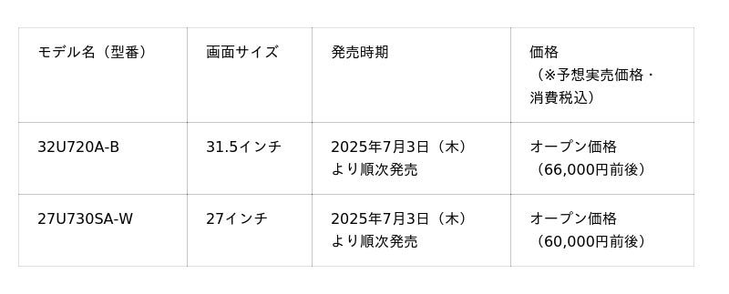 31.5インチ4Kモニター「32U720A-B」と、27インチ4K webOS搭載モニター「27U730SA-W」を7月3日より順次発売