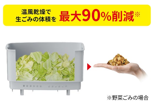 モードは速乾モード(約4時間)と通常モード(約8時間)の2モード。どちらのモードでも生ごみをしっかり乾かしきり、最大で90%の体積削減を見込めます。