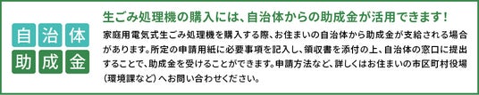 家庭用生ごみ処理機には、各自治体で定められた助成金制度があるのをご存じでしょうか?お住まいの地域によっては、生ごみ処理機購入時に自治体より助成金が支給される場合があります。