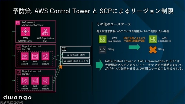 さらに、OrganizationsのSCP機能によって、不必要かつセキュリティホールになりがちな操作を一元的に制限している。これにより、例えば「請求情報へのアクセスのみを制限する」といった細かな制御が可能になる。味戸氏は、「Control TowerやOrganizations SCPは、拡大するAWS環境おいてもセキュリティやガバナンスを効かせられる強力なサービス」と評する。