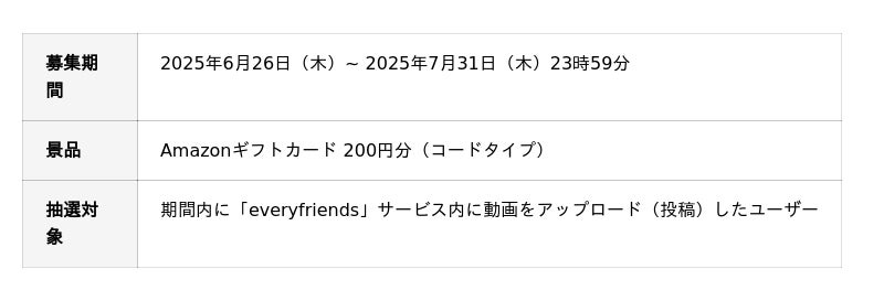 また「everyfriends(エブリフレンズ)」の開設を記念し、「everyfriends」のアカウント作成後に、動画を投稿してくださった方の中から、先着で1,000名様にAmazonギフトカードをプレゼントするキャンペーンを開催しています(※)。