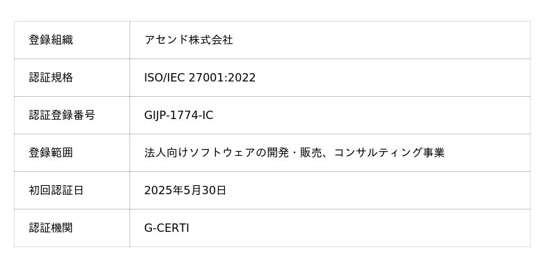 物流DXを推進するアセンド株式会社(本社:東京都新宿区、代表取締役:日下瑞貴、以下「当社」)は、この度、国際規格に基づく情報セキュリティマネジメントシステム(ISMS)「ISO/IEC 27001:2022」の認証を取得いたしましたのでお知らせいたします。