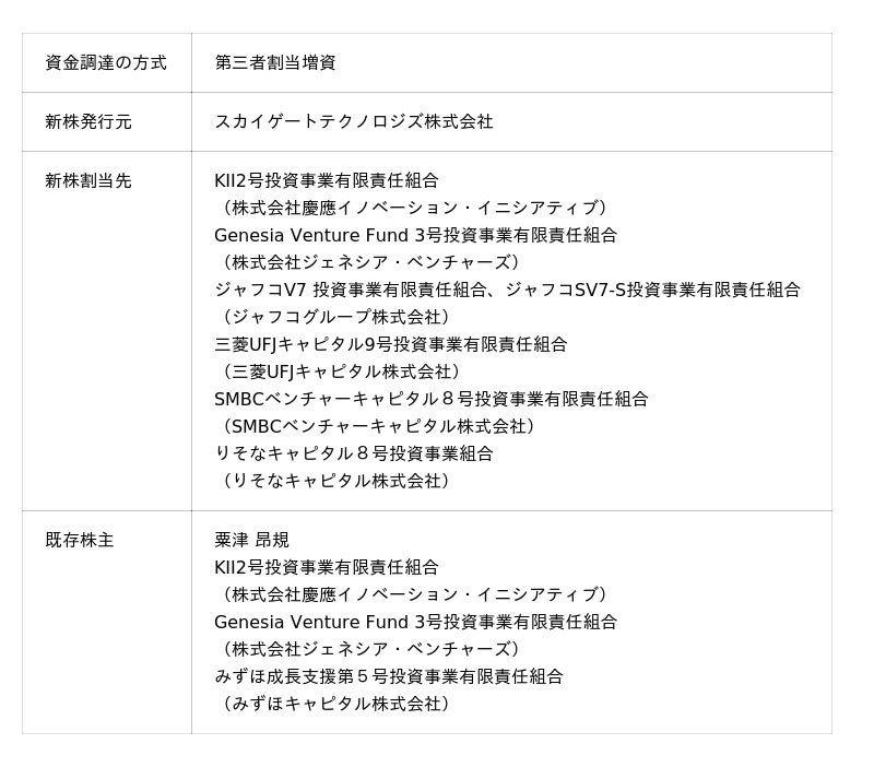 スカイゲートテクノロジズ株式会社(本社:東京都渋谷区、代表取締役:粟津昂規、以下、スカイゲートテクノロジズ)は、既存投資家である株式会社慶應イノベーション・イニシアティブ(代表取締役社長 山岸広太郎)及び株式会社ジェネシア・ベンチャーズ(代表取締役 田島聡一)に加え、新規投資家としてジャフコグループ株式会社(代表取締役 三好啓介)、三菱UFJキャピタル株式会社(代表取締役社長 小島拓郎)、SMBCベンチャーキャピタル株式会社(代表取締役社長 佐伯友史)、りそなキャピタル株式会社(代表取締役社長 相原直也)を迎え、第三者割当増資による資金調達を実施しました。防衛テック市場の確立及び安全保障領域の本格的な課題解決のため、データテクノロジー及びセキュリティに関する技術、製品開発及び事業開発を拡大いたします。