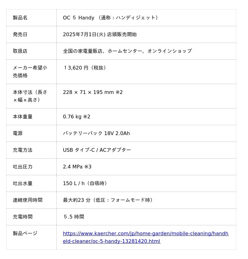 清掃機器の世界最大手メーカー、ドイツ・ケルヒャー社の日本法人、ケルヒャー ジャパン株式会社(本社:神奈川県横浜市港北区、代表取締役社長:柴田佳代子)は、2025年3月よりAmazon.co.jpおよび楽天公式ショップ限定で販売しておりました、モバイル高圧洗浄機「OC 5 Handy (通称:ハンディジェット)」の店頭発売を、全国主要家電量販店およびホームセンターにて2025年7月1日(火)より開始します。また、本発売に伴い、購入者限定のプレゼントキャンペーンを同日より開催いたします。