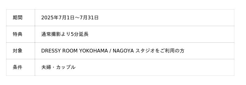 セルフ写真館 PICmiiは、カメラ専門店「カメラのキタムラ」のグループ会社として、撮影画質の仕上がりにこだわったセルフ写真館で、個室での自由な撮影をお楽しみいただけます。DRESSY ROOM YOKOHAMA/NAGOYAスタジオでは、7月限定で『七夕キャンペーン』を実施。七夕にちなみ、7月中に夫婦・カップルでご来店いただいたお客様を対象に、撮影時間を通常プランより5分間延長してご案内いたします。(ご予約時に「七夕割を見た」とお伝えください) この季節ならではの特別なキャンペーンとして、記念日やお出かけの思い出づくりにご活用いただければ幸いです。※ご予約時またはご来店時に「キャンペーンの記事を見た」とお伝えください。