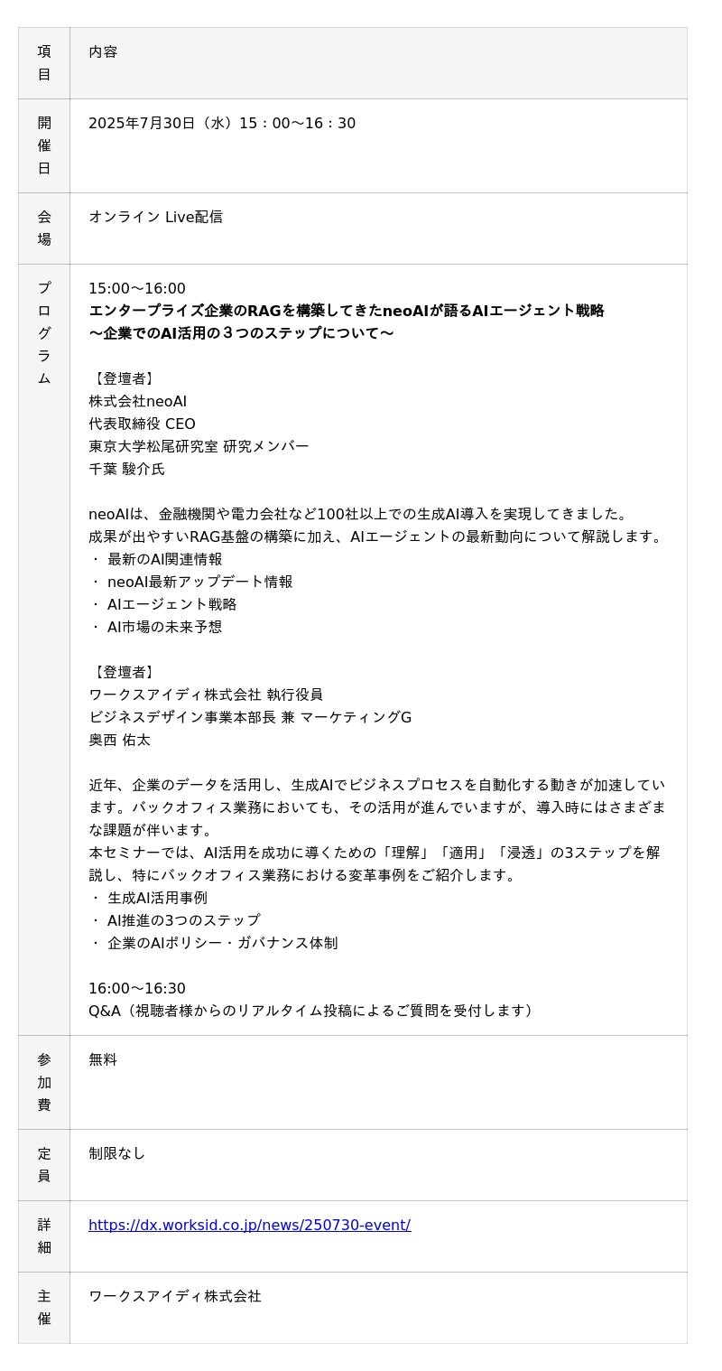 AI・データサイエンス・ITソリューション・人材サービスなどを軸に、クロスファンクショナルなコンサルティングおよびBPaaS(MSP・AI BPO・DX BPO)事業を展開するワークスアイディ株式会社(本社:東京都渋谷区、代表取締役社長:池邉竜一、以下「ワークスアイディ」)は、2025年7月30日(水)に、無料オンラインセミナー「エンタープライズ企業のRAGを構築してきたneoAIが語るAIエージェント戦略~企業でのAI活用の3ステップについて~」を開催いたします。