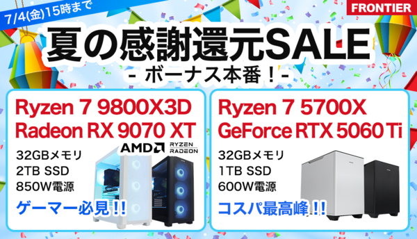 【7月4日まで】FRONTIER「夏の感謝還元SALE」開催中!Ryzen 7 9800X3D搭載の最新ゲーミングPCがボーナス特価で登場