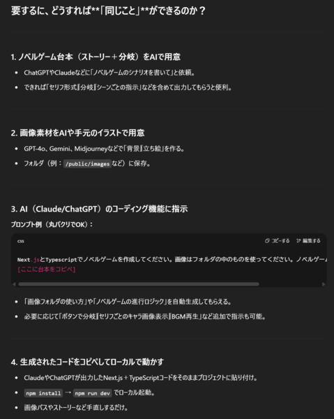 そこでまず、プログラミング能力が高いというChatGPT(GPT-4.1)に、gimuさんの投稿のスクリーンショットを送り、同じようなことを実現するにはどうすればいいかと相談したところ、やることを整理して提示してくれました。Claude Codeを使わなくとも、ChatGPTでコードを作成し、それを貼り付けて動かすだけで作れるというのです。特に、複雑な環境も必要ないとのことでした。そのため、まずはChatGPTだけで作成してみることにしました。