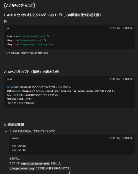 それでさっそく作りはじめるのですが、Webプログラミングの知識がまったくないので、「Next.js」や「TypeScriptコード」が何を意味しているのかがわかりません。わからないことは片っ端からChatGPTに聞いていくことで、Next.jsはWebアプリの構築に使われるJavaScriptフレームワークのことだとか、TypeScriptとはプログラミング言語だといったことを初めて理解できました。その後、フォルダ指定の場所から、構成方法、必要なもののインストール手順などを次々に説明してくれるので、その手順をそのまま実行していきました。