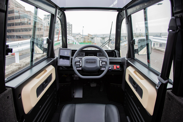 そう語る楠氏が開発したのが、1人乗りの電動ミニカー「mibot(ミボット)」だ。車両区分は原付ミニカー。最高時速60km、航続距離100kmで、家庭用の100Vコンセントで手軽に充電できる。リアラゲッジ(後部荷室)には45kgまで荷物を積載可能で、エアコンとドア付きの快適設計。雨の日も、真夏や真冬もストレスなく乗れる。