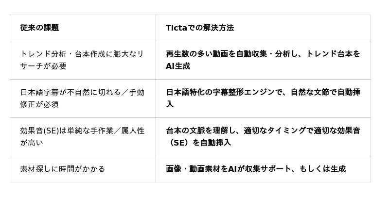 Tictaは、台本作成から素材収集、効果音、字幕、動画出力までを一貫して効率化、自動化する、縦型ショート動画に特化したAI動画作成ツールです。