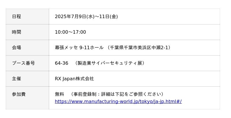 ブース番号:64-36(製造業サイバーセキュリティ展)