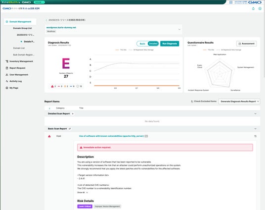 「GMOサイバー攻撃 ネットde診断 ASM」は、組織全体のIT資産を自動で可視化し、脆弱性対策を一元管理するツールです。「はじめての方でも使いやすい国産ASM」として、日本企業を対象にサービスを提供してまいりました。