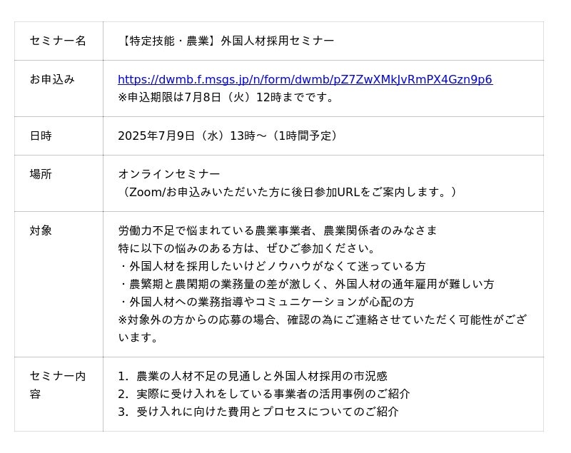 【特定技能・農業】7月9日(水)外国人材採用セミナー / オンライン・無料参加