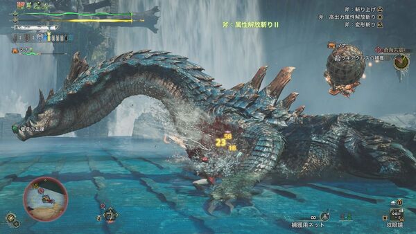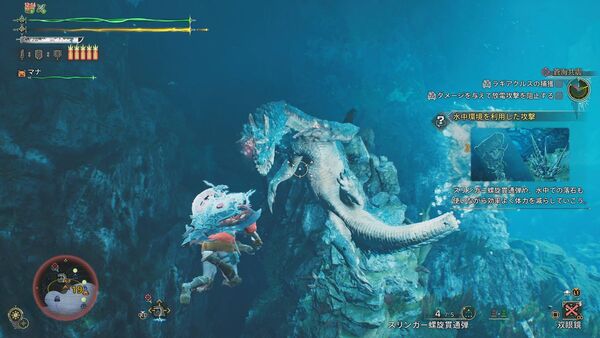 L2で照準をあわせ、スリンガーでラギアクルスにしがみつき、キズを付けたり武器で攻撃したりできる。また、「尖った蔓脚類の群生」というものを採取すればスリンガー弾として撃ち出せるし、「水没している瓦礫」を引っ張れば崩して大ダメージを与えられる。