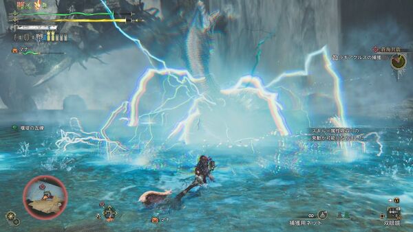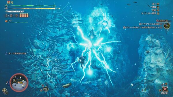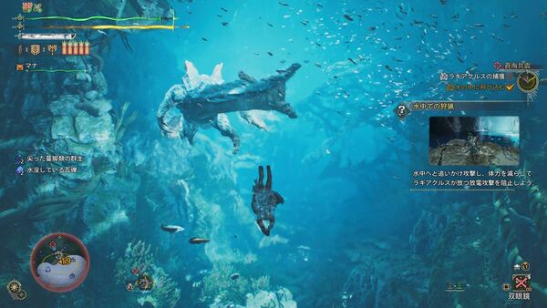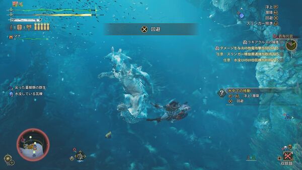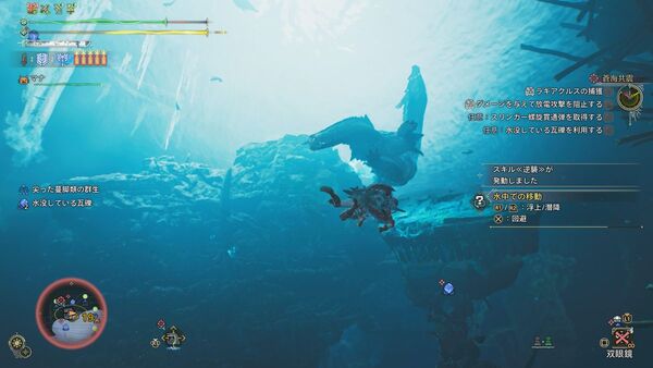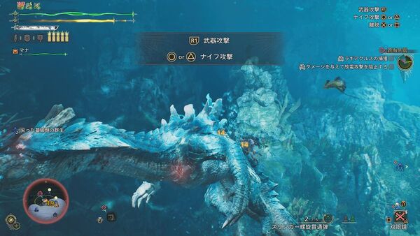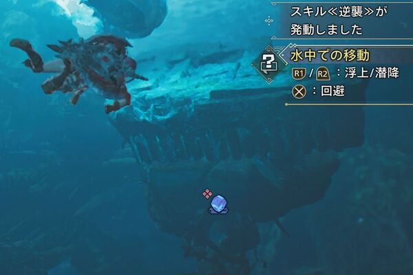 最初は陸上で戦い、順調に体力を削ると水中戦へ移行。操作はPS5基準で、R1「浮上」、R2「潜降」、×「回避」が基本。ラギアクルスの体当たりや電撃を水中で避ける感覚は、在りし日の「モンハン3」を思い出す。あぁ、これ思ってた以上に“水中戦”だ……!