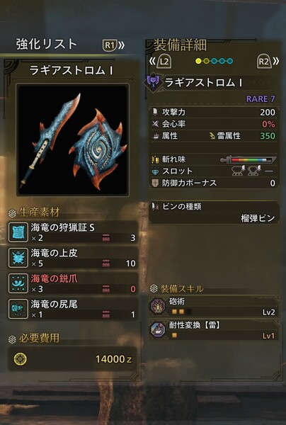というわけで、ラギアクルス初日レポートをお届けした。生産できる防具は「弱点特効」「渾身」などが付く内容で、武器は全武器種用意されている。