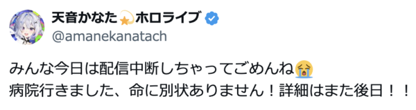 そして同日の20時頃、天音かなたさんの公式Xアカウントが「みんな今日は配信中断しちゃってごめんね😭 病院行きました、命に別状ありません!詳細はまた後日!!」と投稿。かなたさんの命に別状がないことを伝えていました。