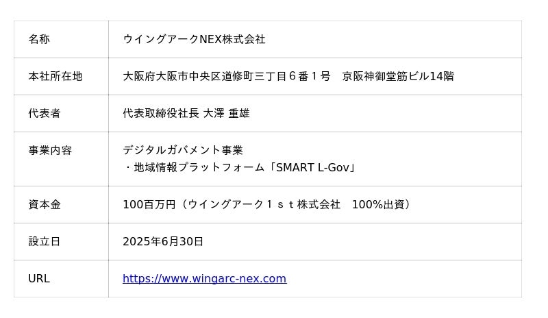 ウイングアークNEX株式会社(本社:大阪市中央区、代表取締役社長 大澤重雄、以下ウイングアークNEX)は、2025年6月30日にデジタルガバメント事業を主たる事業とする子会社として、株式会社スマートバリュー(本社:大阪市中央区、取締役兼代表執行役社長 渋谷順)により設立され、同事業を承継しました。