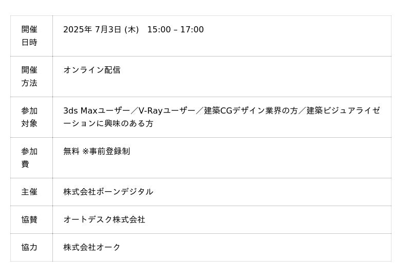 株式会社ボーンデジタル(本社:東京都千代田区、代表取締役:新 和也、URL:https://www.borndigital.co.jp/)は、建築ビジュアライゼーション分野に携わる方々を対象にしたオンラインセミナー「教えて公式先生!リターンズ(3ds Max & Chaos/建築VIZ編)」を2025年7月3日(木)に開催いたします。
