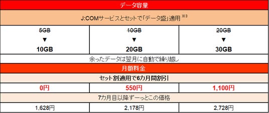 ※3 データ盛適用で5GBがデータ増量で10GB、10GBがデータ増量で20GB、20GBがデータ増量で30GBとなります。
