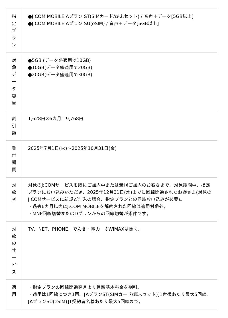 ・割引期間中に対象のJ:COMサービスを解約・転居された場合や、指定プラン以外へ契約変更された場合、割引は終了。