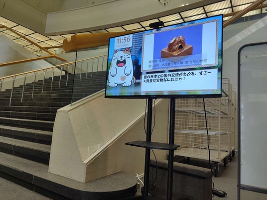 福岡市博物館内に、生成AI活用した大型デジタルサイネージシステムを設置、来館者と会話ができるネコのAIキャラクターが館内を案内します。
