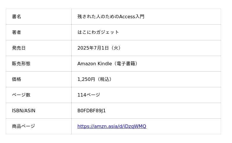 合同会社BlueAge(本社:千葉県船橋市、CEO:安田 久美子、以下「BlueAge」)は、Accessファイルの引き継ぎ・修正・運用に悩む実務者のための書籍『残された人のためのAccess入門』を、2025年7月1日(火)よりAmazon Kindleにて発売いたします。