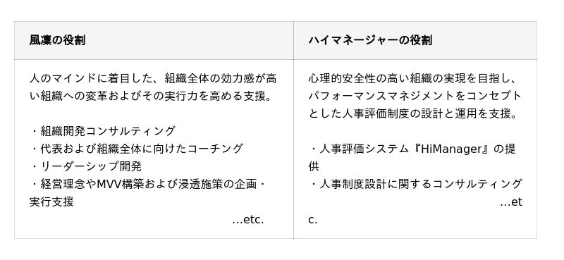 本提携により、ハイマネージャーが提供する人事評価システム『HiManager』および、人事評価制度を中心としたコンサルティングサービスの強みと、風凜が提供する組織・人のマインドセットや企業文化・風土(=組織OS)の変革を支援する組織開発サービスが連携。組織の根幹にある課題に深く踏み込み、より確実で実践的な組織変革を後押しします。