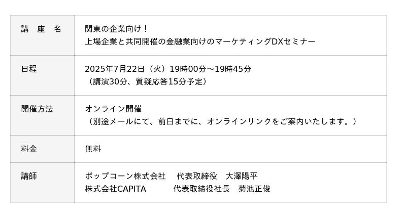 金融業向けマーケティングクラウド「ポップコーン」(以下「ポップコーン」)では、月額5万円よりマーケティング・DXの顧問サービスをご提供しています。