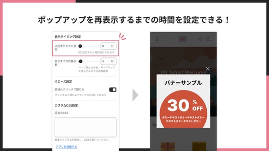バナーが表示されるタイミングや、再表示までの待機時間を細かく設定できます。たとえば「ページ表示から5秒後に表示」「3日間は再表示しない」など、ユーザー体験を損なわないよう柔軟に調整が可能です。マーケティング施策に合わせて最適化しましょう。
