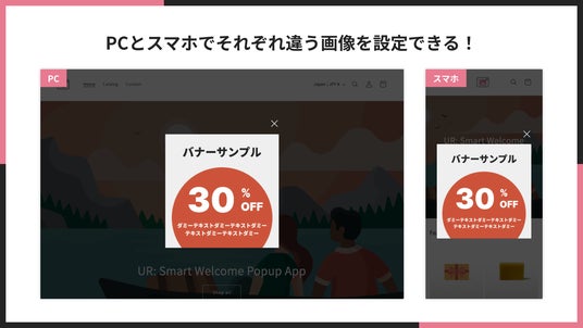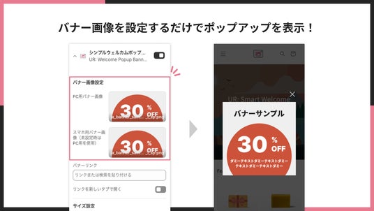 バナー画像を設定するだけで設定は完了。複雑な設定項目はなく、ポップアップの内容は視覚的に確認しながら編集できます。バナー画像には新商品の情報、割引キャンペーン、メール登録の誘導など、自由なデザインが可能です。