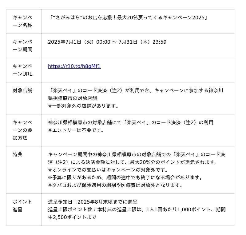 楽天ペイメント株式会社(以下「楽天ペイメント」)は、運営するキャッシュレス決済サービス「楽天ペイ」において、神奈川県相模原市が2025年7月1日(火)から7月31日(木)まで実施する「“さがみはら”のお店を応援!最大20%戻ってくるキャンペーン2025」に参加することをお知らせします。