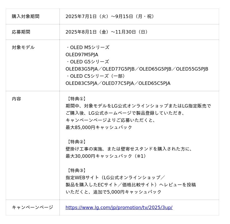 LGエレクトロニクス・ジャパン株式会社(代表取締役:孫 成周(ソン・ソンジュウ) 本社:東京都中央区)は、有機ELテレビの2025年モデルを発売するのを記念し、対象モデルのご購入で最大12万円をキャッシュバックする『3UPキャンペーン』を本日2025年7月1日(火)より実施します。