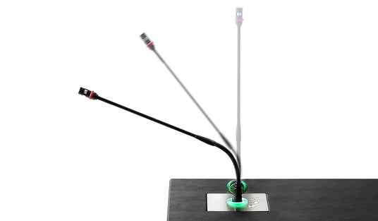 DynamicTalk:ボタン操作または外部制御によりマイクが自動昇降。ネームタグやLEDライトとの統合も可能。